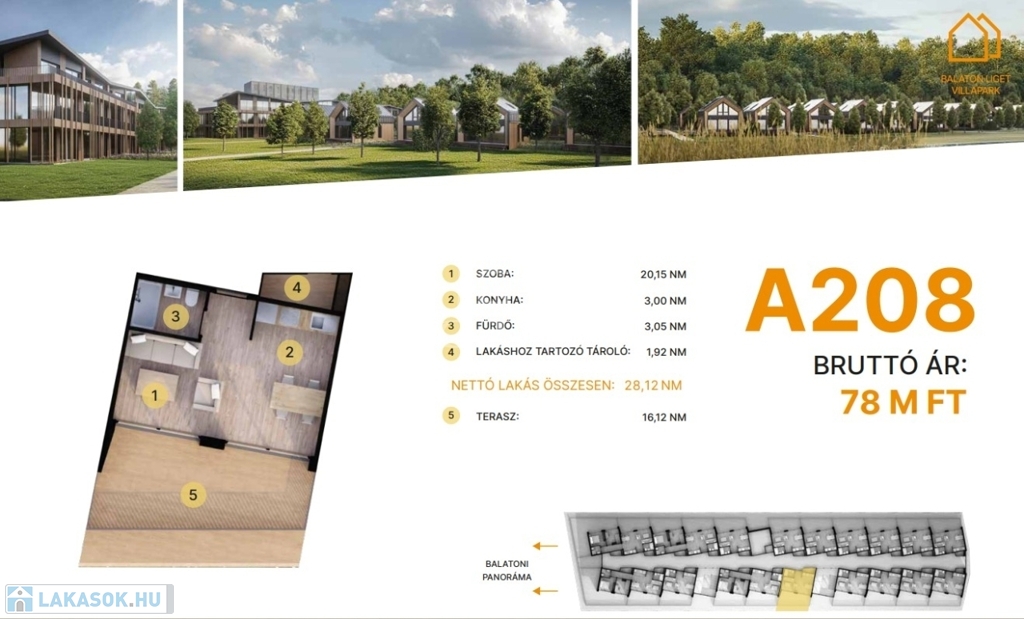 Az első emeleten további 21 lakás érhető el, 47–75 m² közötti méretben.