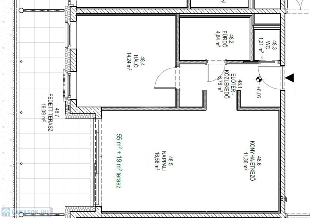 Ez a lakás nappali+1 hálós, 55nm alapterületű+ tartozik hozzá egy 19nm-es fedett terasz is.