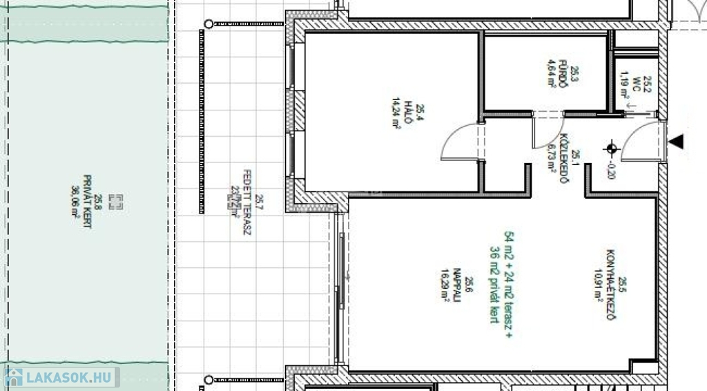 Ez a lakás nappali+1 hálós, 54nm alapterületű+ tartozik hozzá egy 24nm-es fedett terasz és 36nm privát kert is.