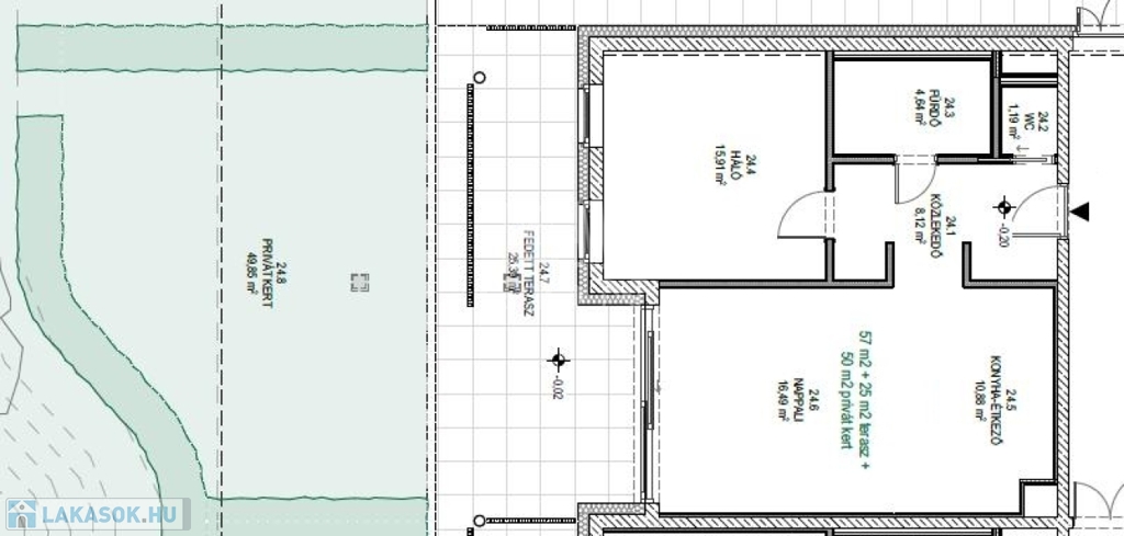 Ez a lakás nappali+1 hálós, 57nm alapterületű+ tartozik hozzá egy 25nm-es fedett terasz és 50nm privát kert is.