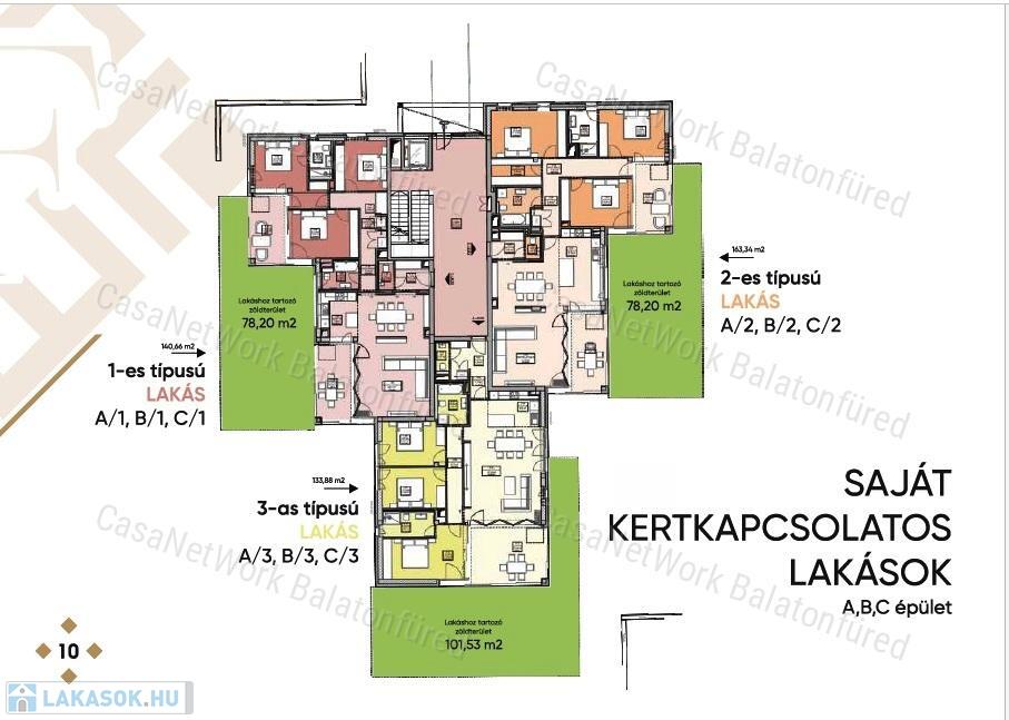 A földszinteken saját kertkapcsolattal, a köztes szinteken 3-3, a legfelső