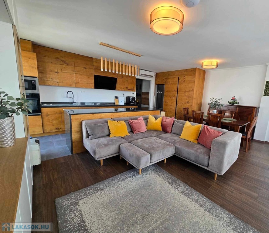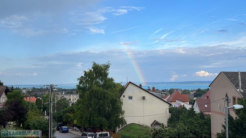 A 83 m²-es ingatlan praktikus elosztású: tágas, közel 40 m²-es nappali–konyha–étkező, 2 külön nyíló hálószoba, fürdőszoba, valamint külön vendég WC biztosítja a kényelmes mindennapokat. A nappaliból nyíló, 26 m²-es fedett teraszról gyönyörű panoráma nyílik a Balatonra és a Tihanyi-félsziget irányába.