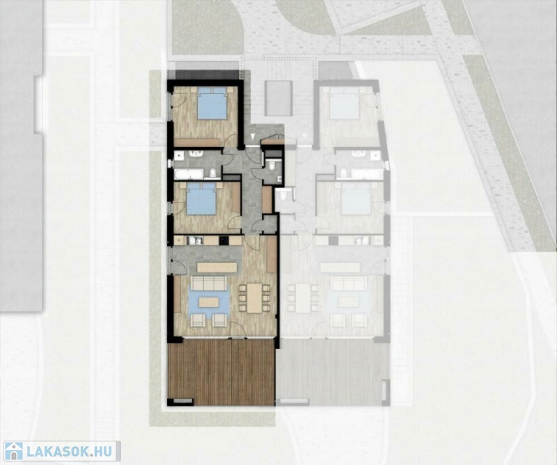A lakópark zárt, parkosított kerttel és közös használatú medencével rendelkezik, amely tovább növeli az ingatlan értékét és komfortját.