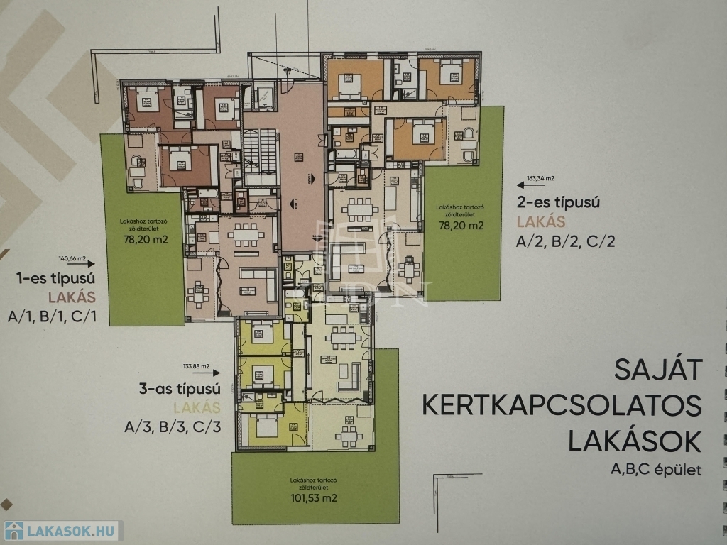Az A 1-es típusú lakás 115,91 négyzetméteres, amelyhez 78,2 négyzetméteres saját kertkapcsolat