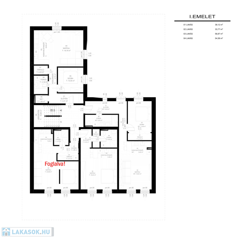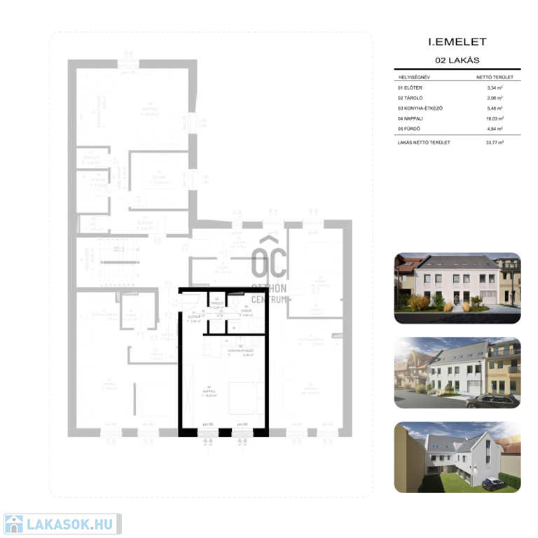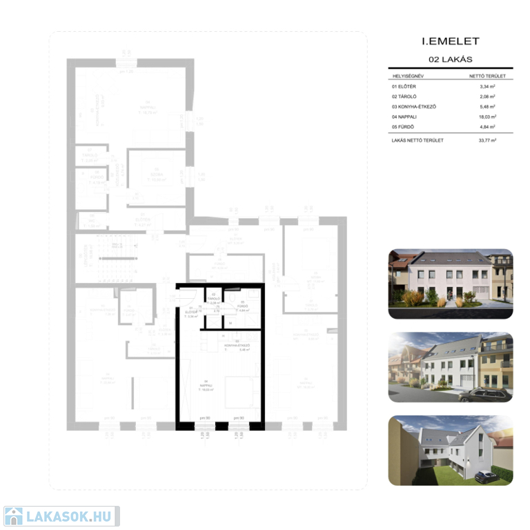 * 1 emeleti, 34 m2-es, 1 szobás.