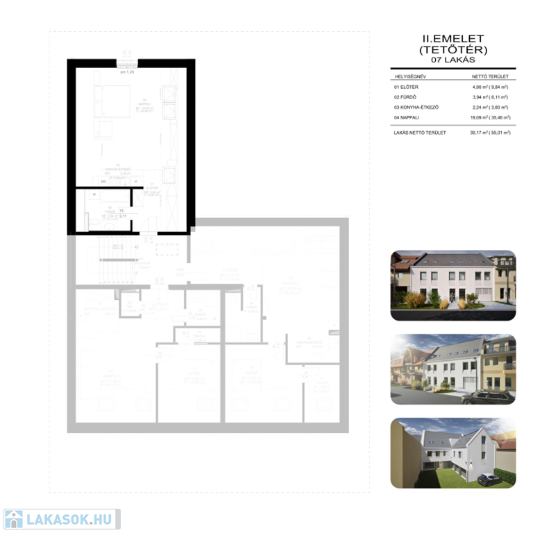 A hirdetésben szereplő 2. emeleti, lakás 30 m2 nettó / bruttó 55 m2-es (tetőtéri)