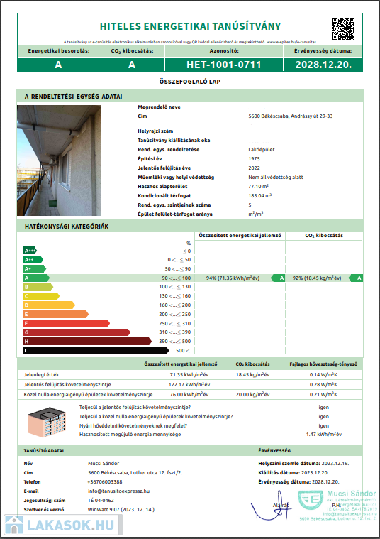 Az ingatlan HITELES ENERGETIKAI TANÚSÍTVÁNY-al rendelkezik (HET-1001-0711), amely alapján az ingatlan energetikai besorolása: A