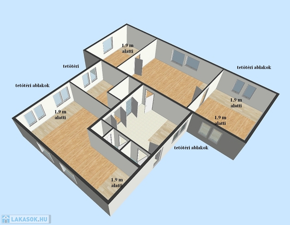 Az ingatlan rendkívül sok lehetőséget rejt magában: egy kisebb átalakítással akár zárt vagy amerikai konyhás nappali is kialakítható, miközben 3-4 hálószoba továbbra is kényelmesen elfér benne.