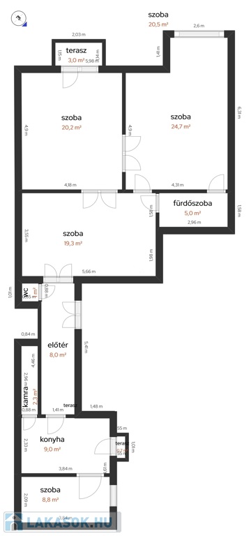 A két nagy szoba a Vérmzőre néz. Egy hall-ból nyílik, ami rugalmasan berendezhető, akár étkezőnek is.