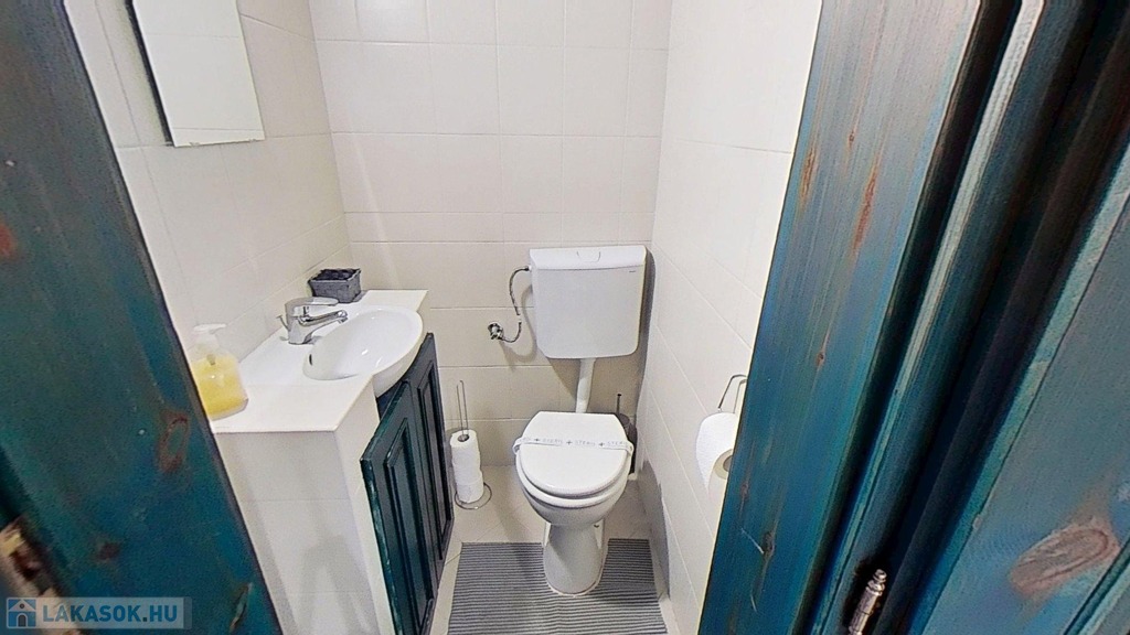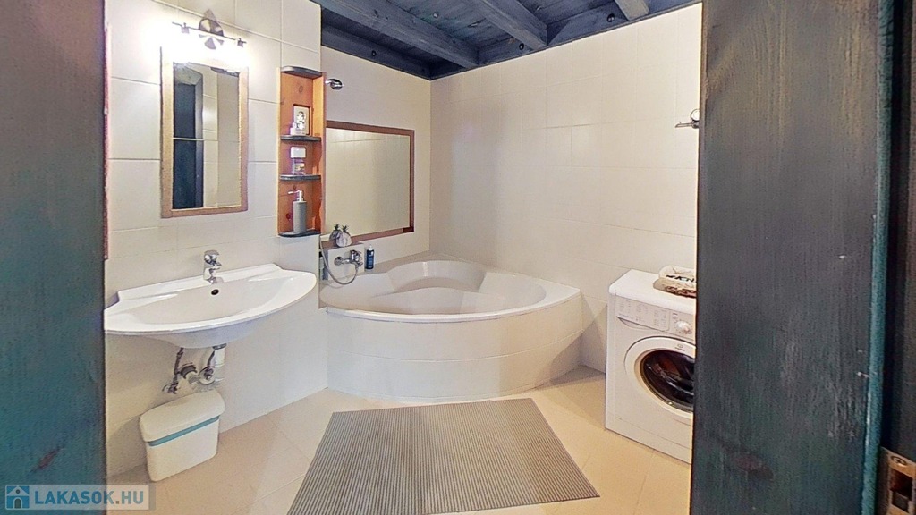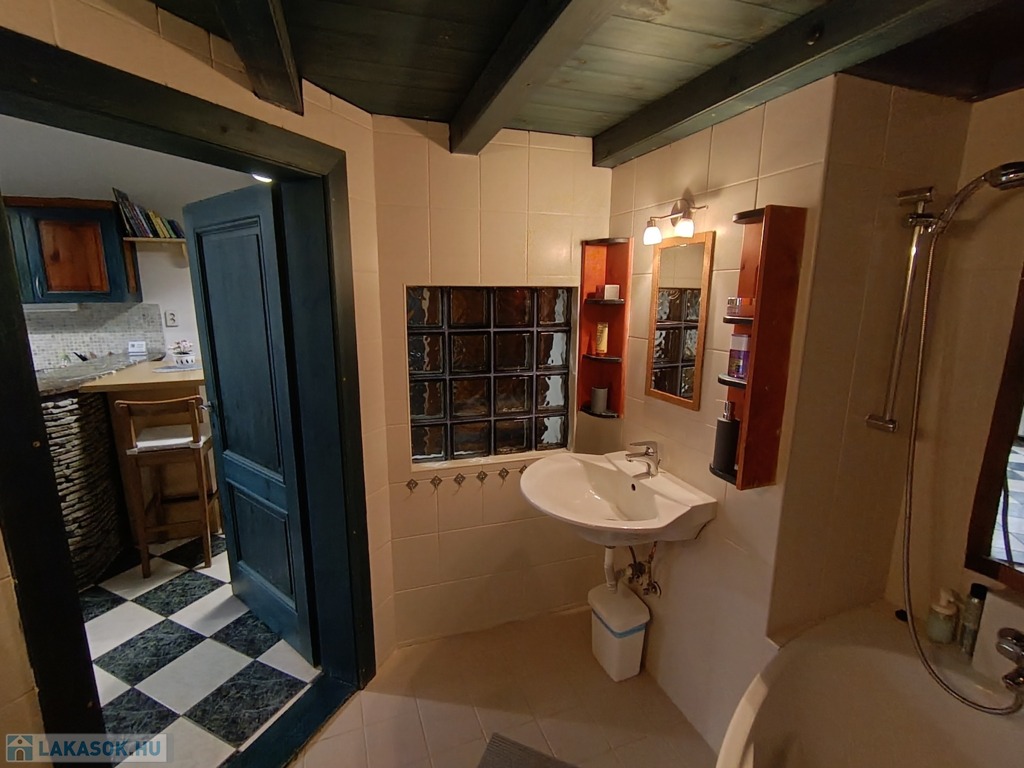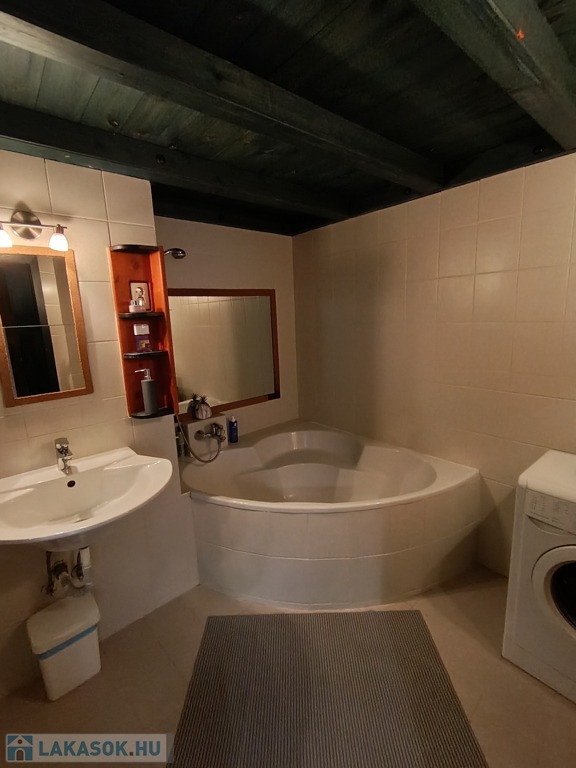 A fürdőszobában tágas sarokkádban fürödhetünk,a wc külön helyiségben kézmosóval is fel van