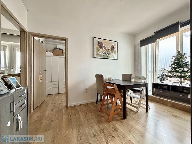A lakás elosztása átgondolt és jól élhető. A nappali mellett két további szoba található, amelyek az ablakos étkezőből külön nyílnak, így ideális választás fiatal párnak vagy kisebb családnak is. Az amerikai konyha szeparált és ablakos, a fürdőszobától külön helyiségben kapott helyet a WC, ami tovább növeli a komfortérzetet. A belső terek kialakítása rugalmas, mivel a lakáson belüli falak mozgathatóak, így ennek köszönhetően az elrendezés könnyen alakítható, akár egyéni igények szerint is.
