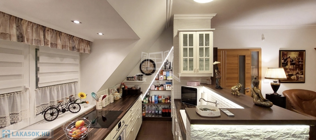 Az 5 lakásos, liftes társasházban található ingatlan világos, jól elosztott, magas minőségben kialakított. A konyha gépesített, a fürdőszobában Grohe és Duravit szaniterek, a nappaliból és hálóból hegyekre néző panoráma.