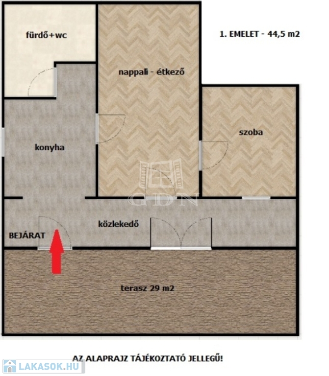 1. EMELET: 44,5 m2 – 2 szoba – 1 fürdő – TERASZ: 29,3 m2