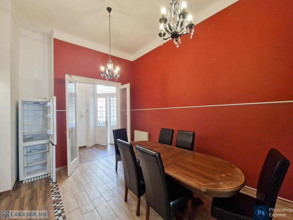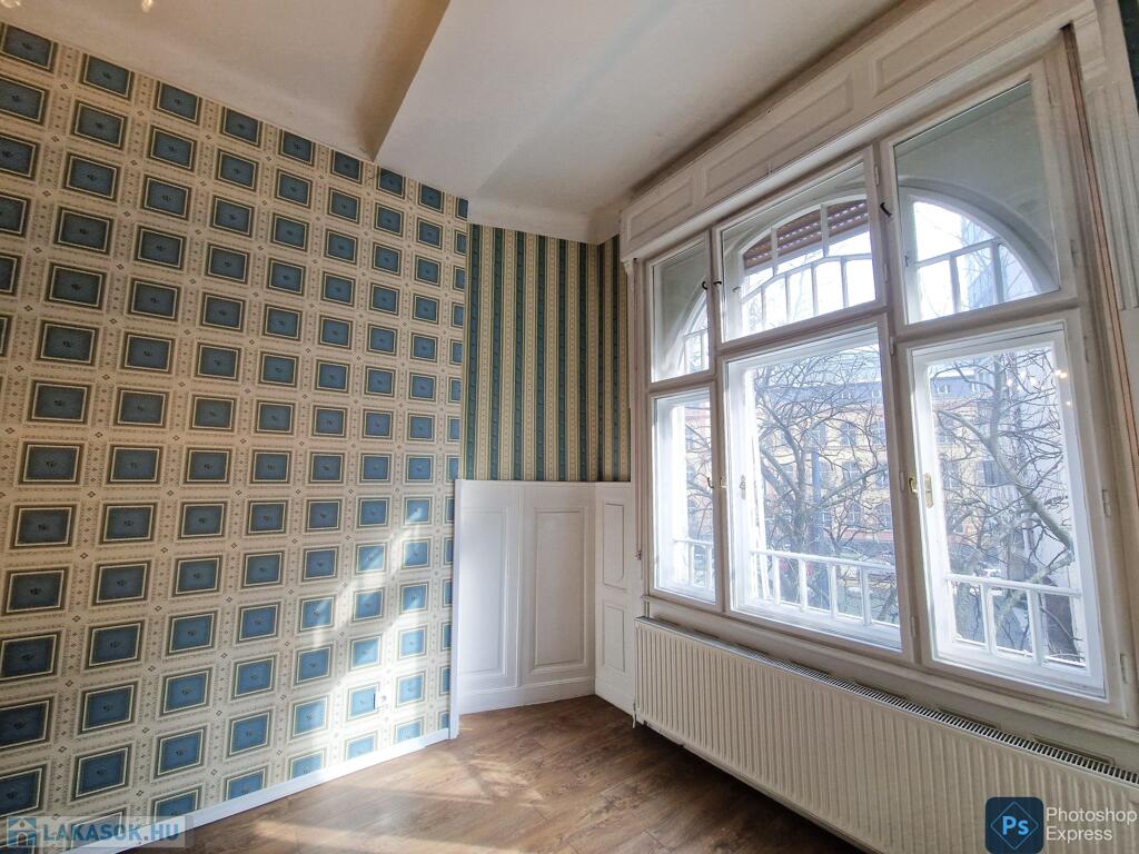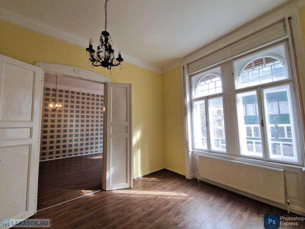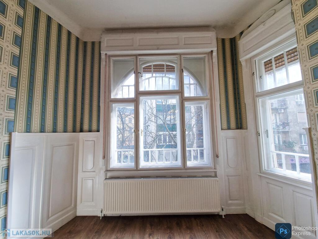 A több,mint 100 éves ház fel van újítva,és csodálatos belső kerttel rendelkezik. Az két lakás egybenyitásával kialakított ingatlan első emeleten található,körfolyosósóról megközelíthető. A kétszárnyú bejárati ajtó tágas előtérbe vezet,és az egész lakást a nagyvonalú ,tágas terek jellemzik.
