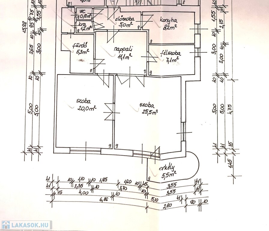 From the ante-room we reach the 11 sqm hall, from which we can access the 3 rooms with separate entrances: the living room is 25.5 sqm, which has a 6 sqm balcony, the bedroom is 20 sqm, and the 3rd room is 7 sqm. There is also a double-wing door between the living room with separate entrance and the bedroom.