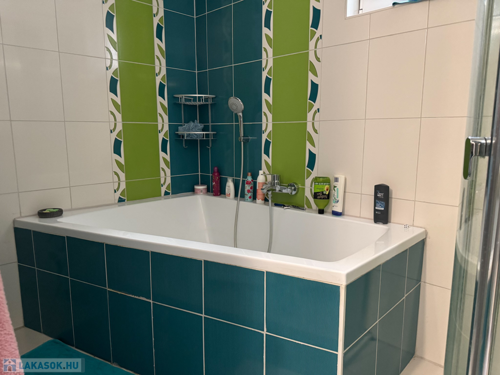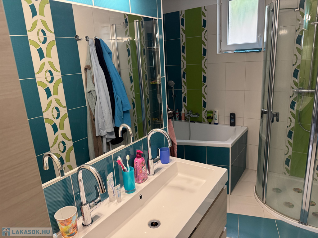 Az ablakos fürdőszobában kád, zuhany, mosdó és WC található. Ezen kívül van még egy külön wc is.