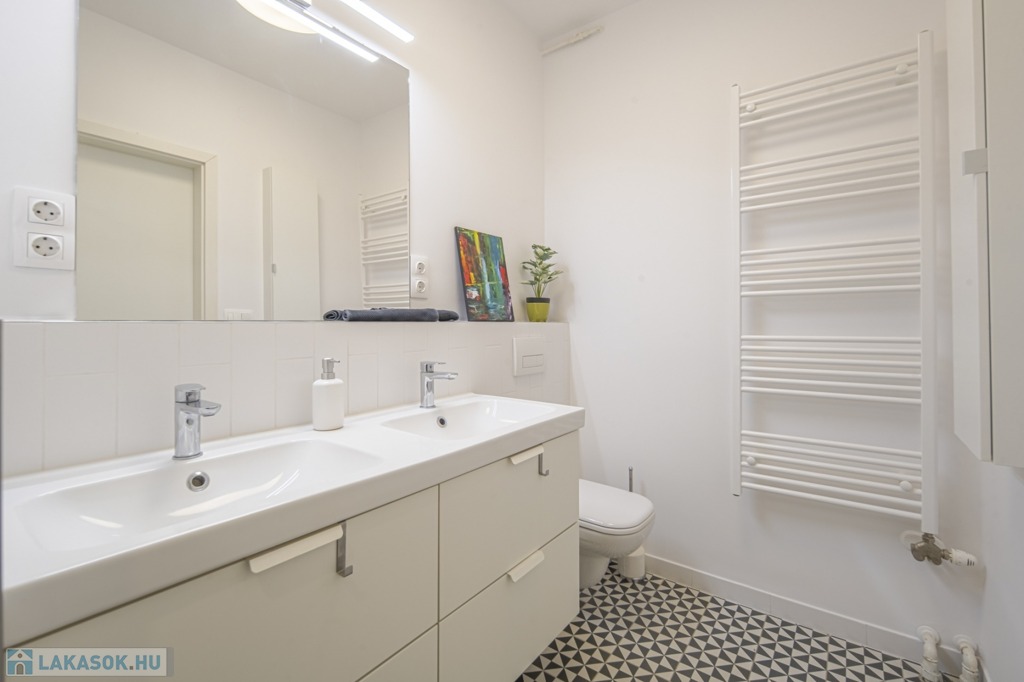 A fürdőszoba zuhanyzós, duplacsappal szerelt, valamint a külön WC mellett itt is található WC.