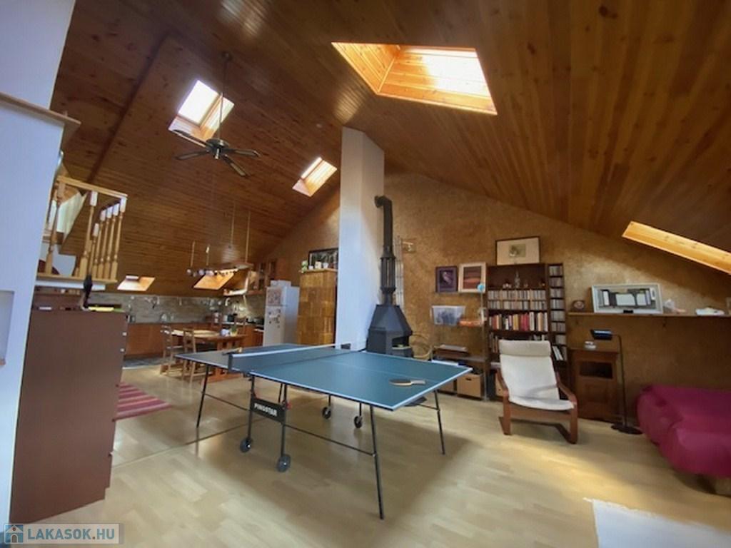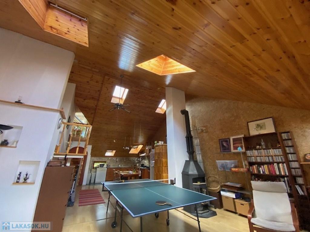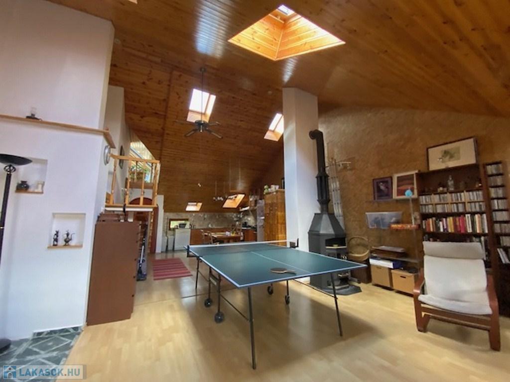 Az előszobából a másik irányba haladva érünk be az ingatlan fő attrakciójához, egy kb 50 nm-es, 4,5 belmagasságú ( legmagasabb pontja) nappaliba. Itt találhatjuk a világos, tágas amerikai konyhát, étkezővel. A nappali további részén jelenleg többek közt pingpong asztal is helyet kapott. Az otthonos, meleg hangulatról a mennyezeti , dupla szigetelésű falambéria, a cserépkályha és egy kandalló gondoskodik.