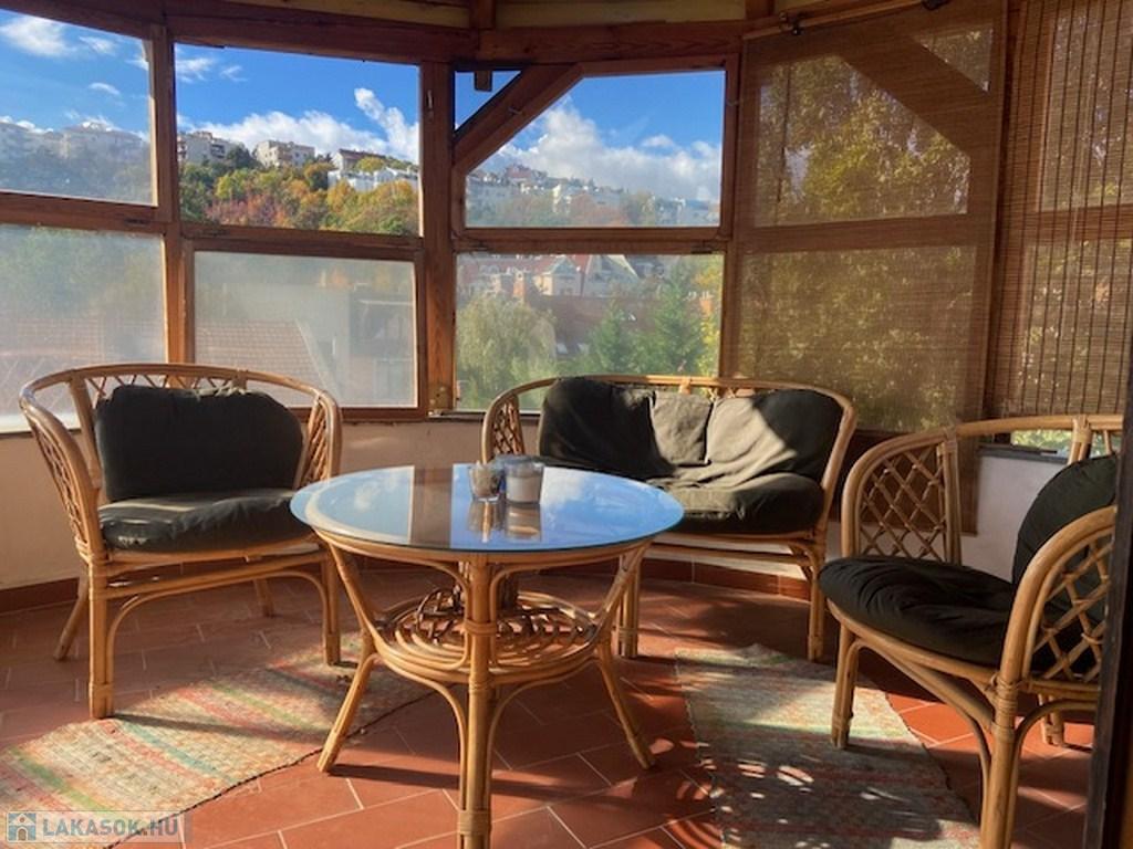 A nagy ablakos közlekedő végén találjuk a beüvegezett, hangulatos teraszt, ahonnan páratlan panoráma tárul elénk, mely délnyugati fekvésének köszönhetően egész nap világos.