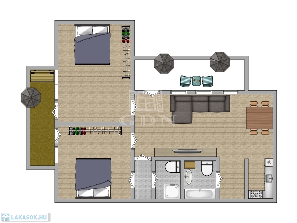 A lakás három szobából áll, melyek tágasak és világosak.