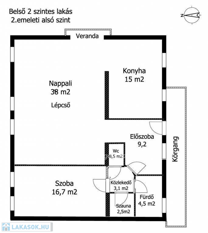 A 175 nm-es, belső kétszintes lakás jelenleg is jó beosztású. Világos és csendes, nagyvonalú terekkel rendelkező, jelenleg 3,5 szobás otthon. Jó alaprajzának köszönhetően több átalakítási lehetőség is rejlik a lakásban, amely amerikai konyhás nappali + 3-4 hálószobás lakássá is alakítható. Az ablakok a ház szép és csendes kertje felé néznek, DNY-i és ÉK-i tájolásúak. Az ingatlan egy 35 nm-es panorámás, tetőtéri terasszal rendelkezik, amely felújítás után az ingatlan egyik ékessége lesz.