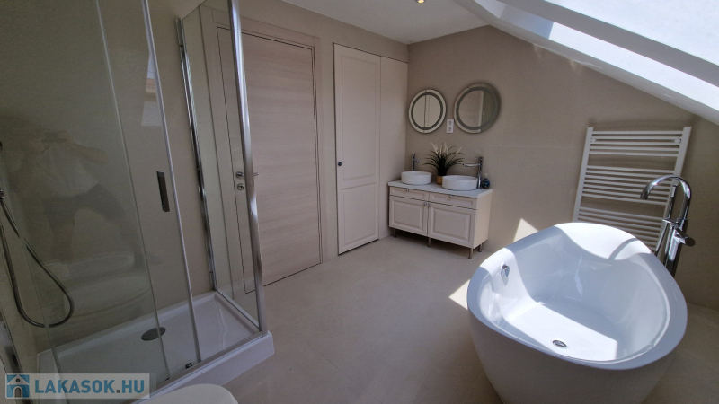 Rózsadomb alján, Mechwart ligethez közel, a Buday László utcában, eladó egy belső kétszintes, teljeskörűen, igényesen felújított, 3. emeleti, nettó 144nm-es (bruttó 177nm), 5 szobás, 3 fürdőszobás, világos, csendes, tehermentes, üres, azonnal költözhető lakás.