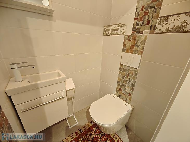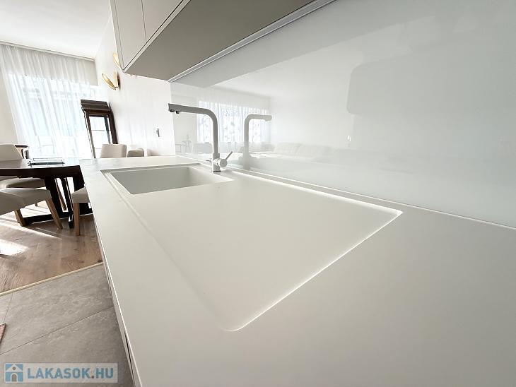 Az ingatlan fűtéséről egy Bosch kondenzációs kazán gondoskodik, a felső szinten padlófűtéssel, az alsó szinten pedig radiátoros fűtéssel. Szintén bekerült egy ultrahangos vízlágyító is. Mindkét szinten prémium minőségű burkolatok és szaniterek kerültek kiválasztásra és le-, illetve behelyezésre.