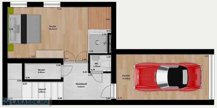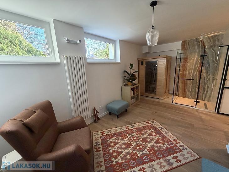 Az alsó szinten egy egyedi szoba kapott helyet. Egyediségét a beépített zuhanykabin és az infraszauna adja. Ezenkívül egy külön wc, egy tároló és a garázs. A garázs parkettázott és szekcionált motoros kapuval ellátott, melynek vételára +15M Ft, kötelezően megvásárolandó.