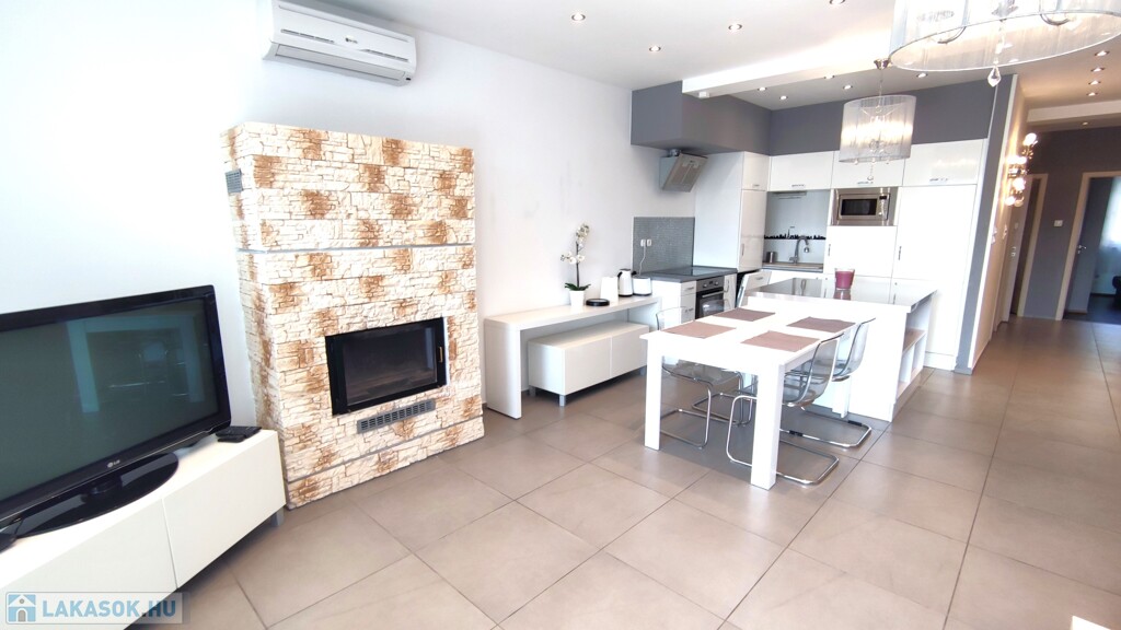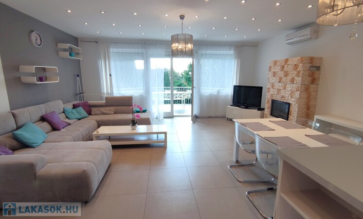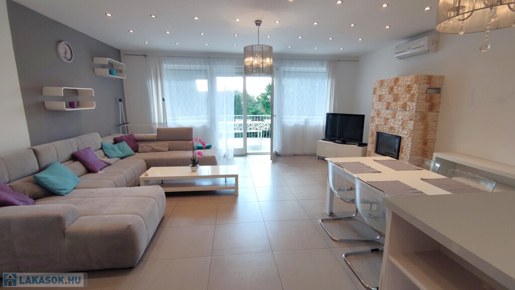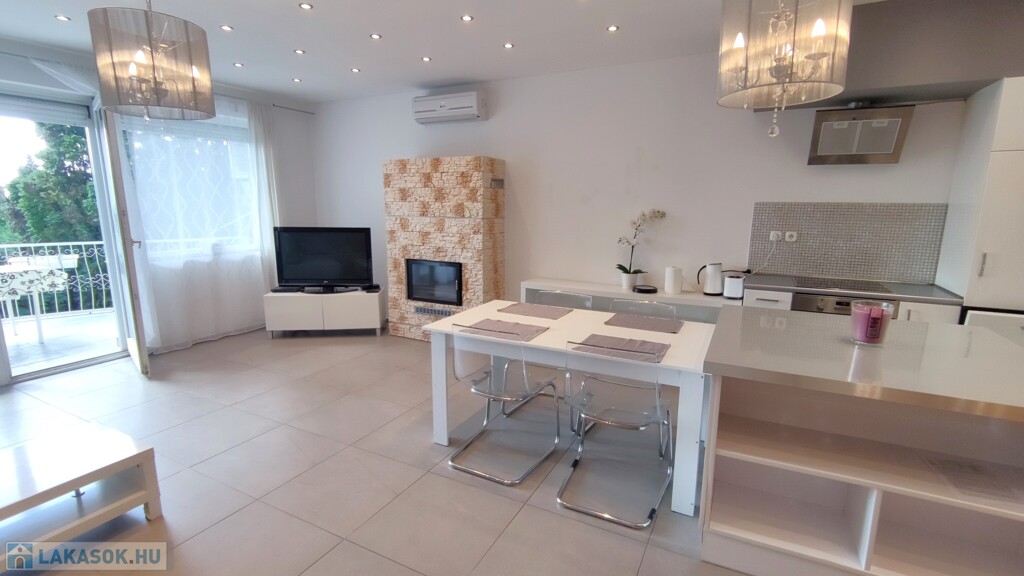 Az amerikai konyhás étkező-nappali hatalmas ablakain árad be a napfény, az erkélyről pazar kilátás nyílik a belső kertre és a medencére. Az elektromos kandalló kellemes hangulatot áraszt. Az ablakok redőnyökkel felszereltek. A lakást 2006-ban teljeskörűen felújították.