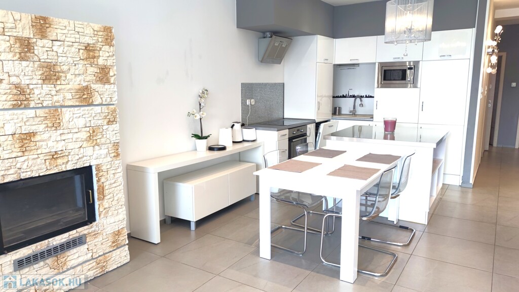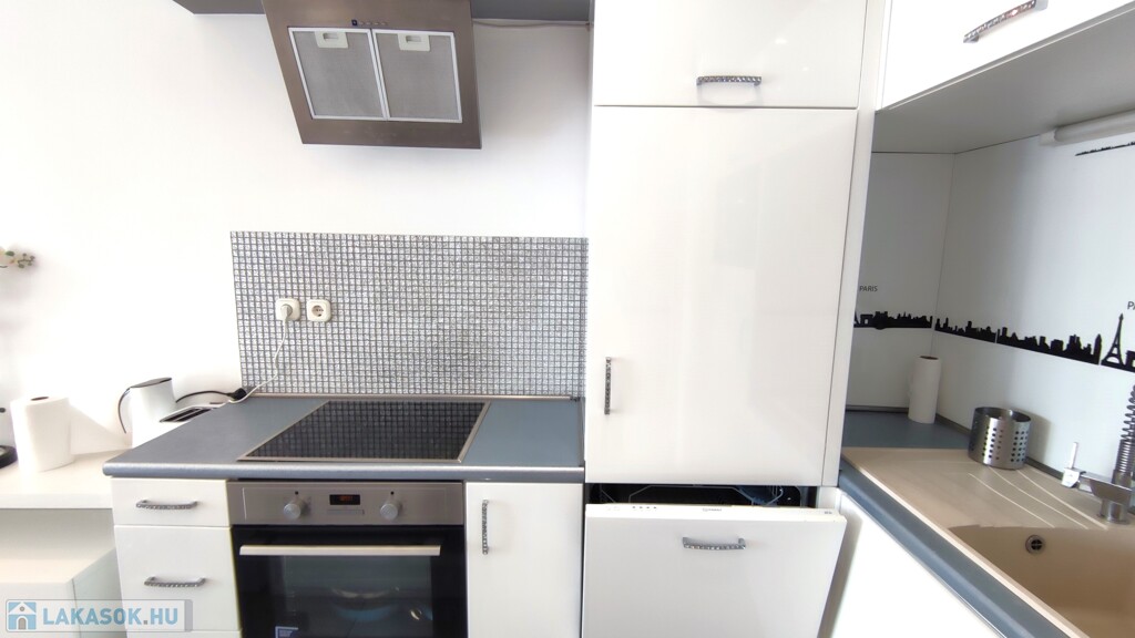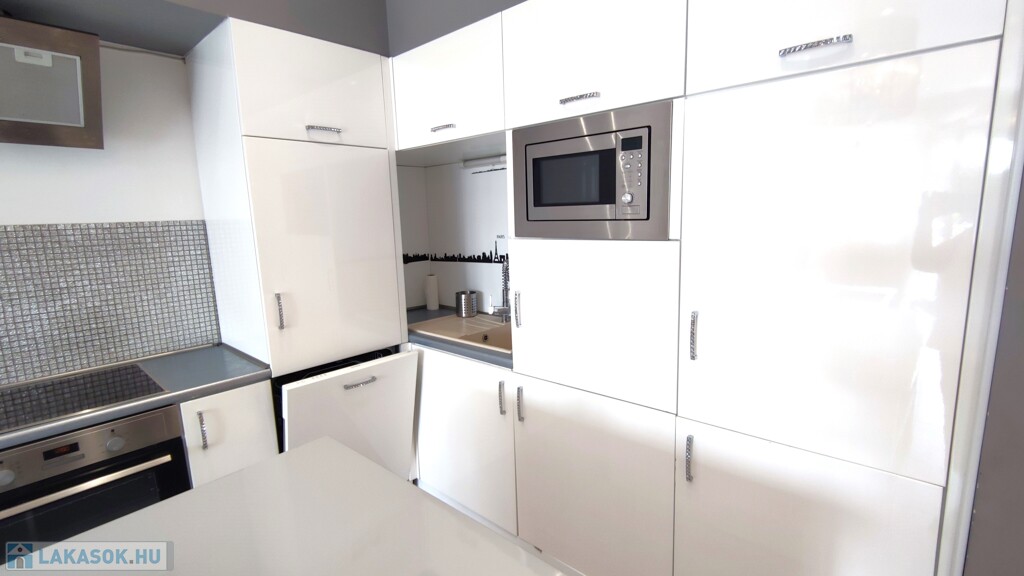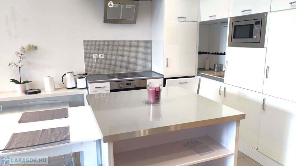 A konyha elektromos tűzhellyel, mosogatógéppel, hűtővel, mosógéppel felszerelt, konyhasziget is tartozik hozzá.