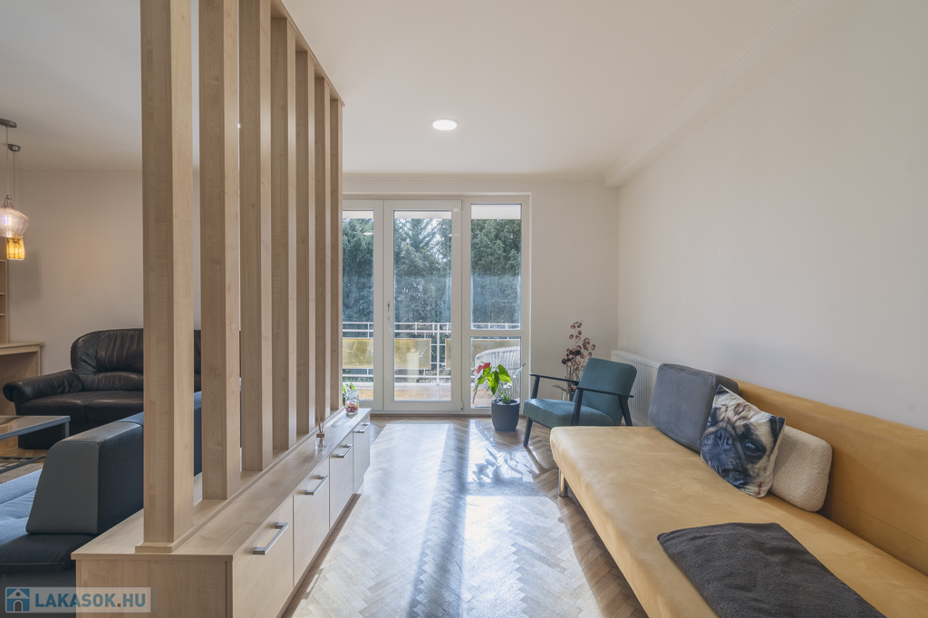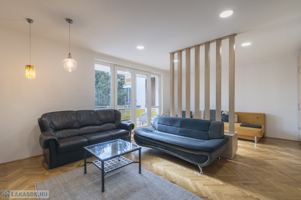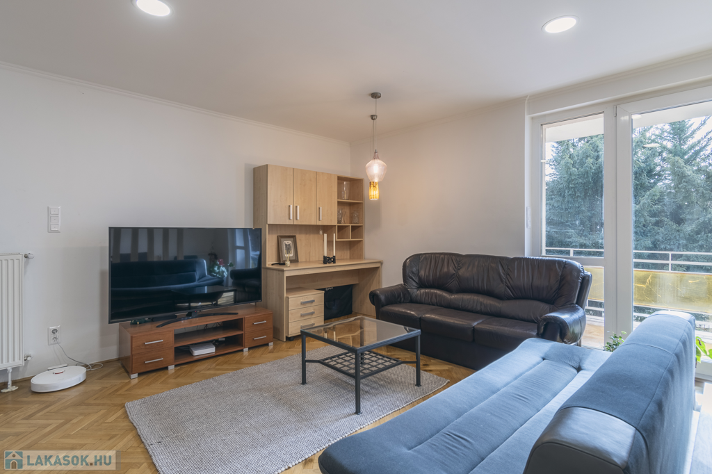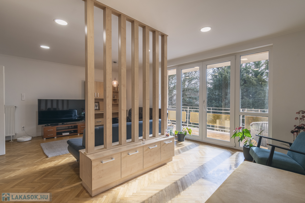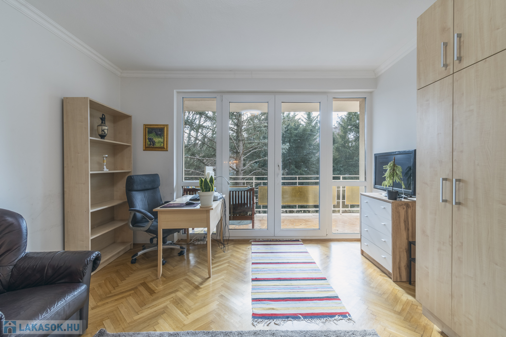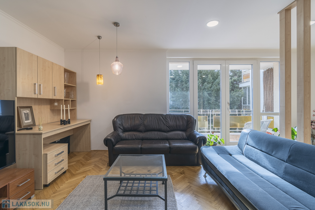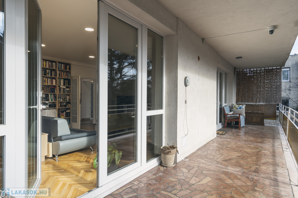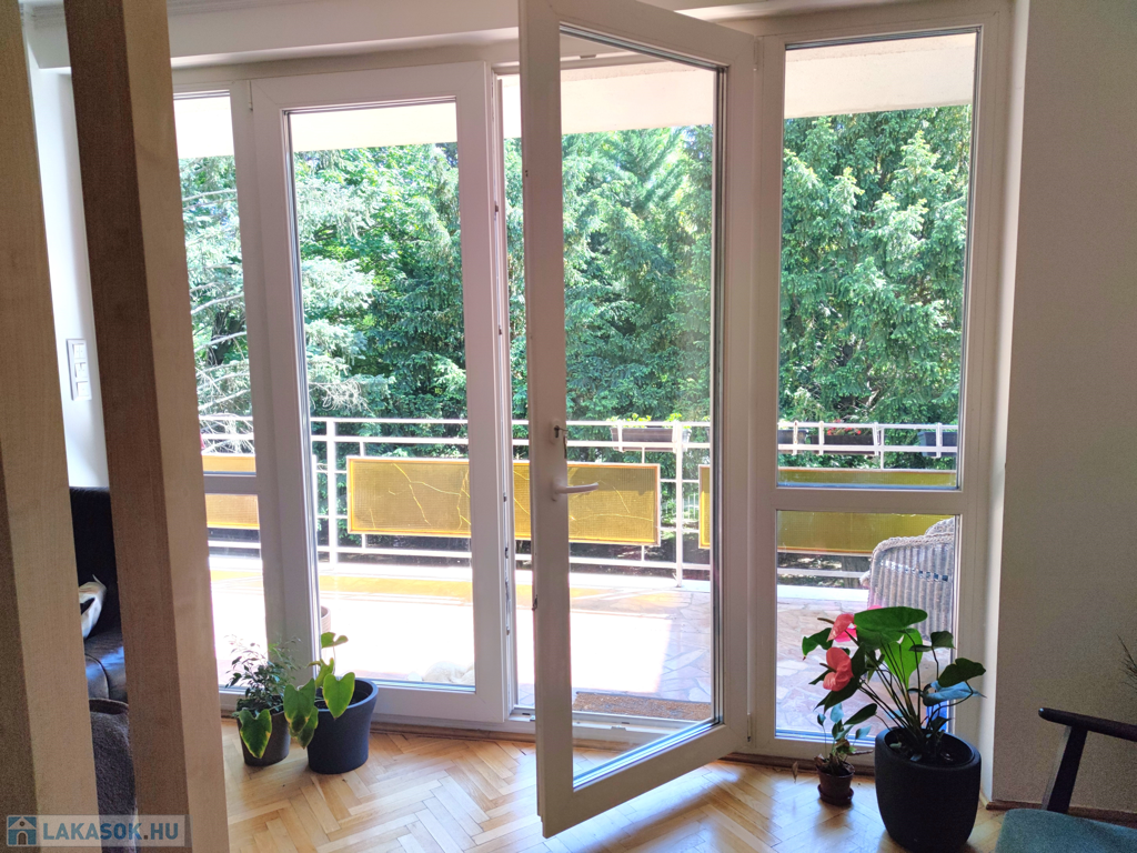 A lakás délnyugati fekvésű, 23 nm-es napfényes teraszáról gyönyörű kilátás nyílik a zöld környezetre. Mindhárom szoba kertre néző, külön bejáratú, a nappali és az egyik hálószoba is a teraszra nyílik.