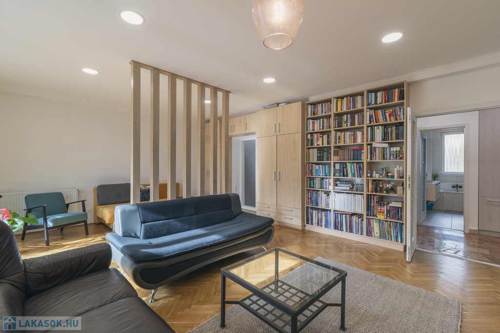 Bp., 2.ker. TÖRÖKVÉSZ ÚTON, Rózsakert Bevásárlóközpont közelében, az utcától távol eső, 120 nm-es, nappali + 2 hálószobás, étkező konyhás, félemeleti, FELÚJÍTOTT, nagy teraszos lakás eladó dupla garázzsal.