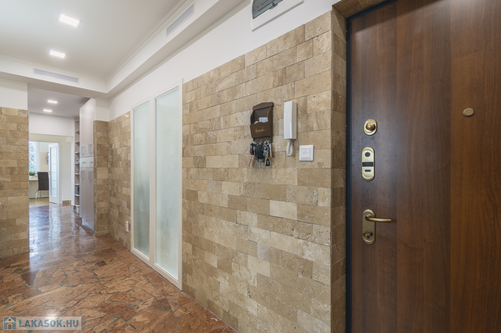 A folyosó oldalai travertini mészkővel vannak ékesítve, melyek kíválóan illeszkednek az egyedi gyártású szekrény és fiókrendszerekhez.