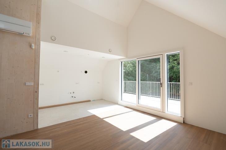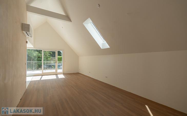 Az eladásra kínált lakás a társasház legfelső lakása, mely amerikai konyhás nappaliból, 2 hálószobából, fürdőszobából és külön wcből áll. A hálószobákból nyílik egy 5nm-es erkély, illetve a nappaliból nyílik egy 16nm-es napfényes terasz. A lakás ugyan tetőtéri, de a tervezéskor gondoskodtak a jól bútorozhatóságról, ezért a térdfal 1,70cm.