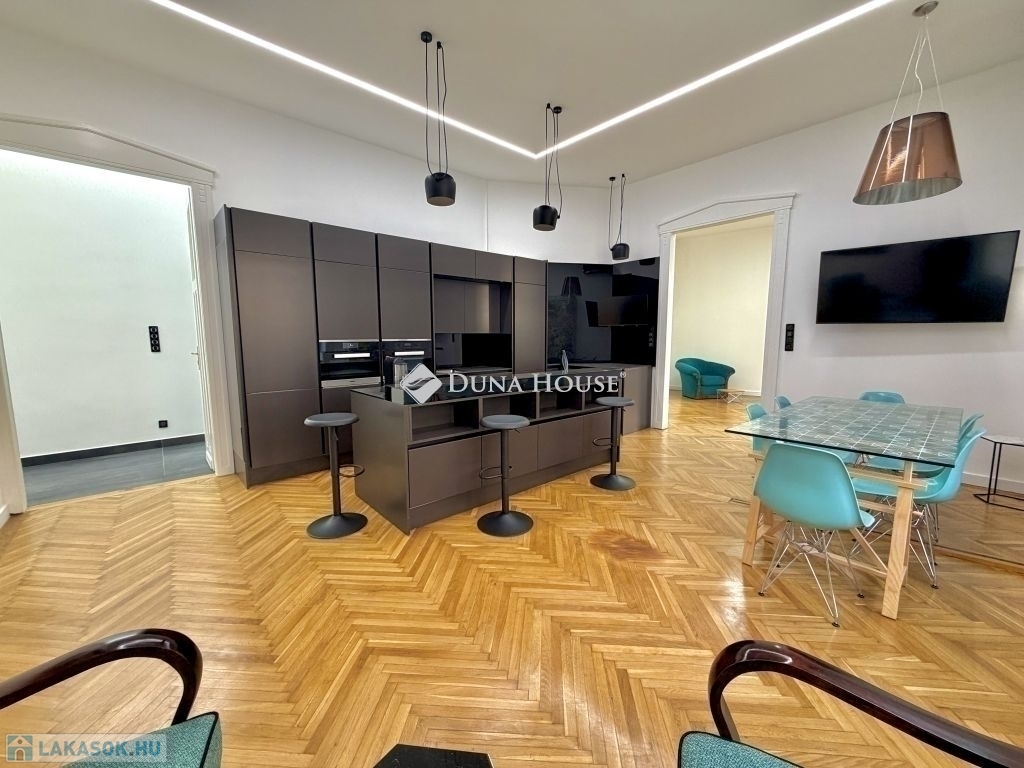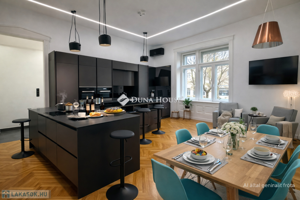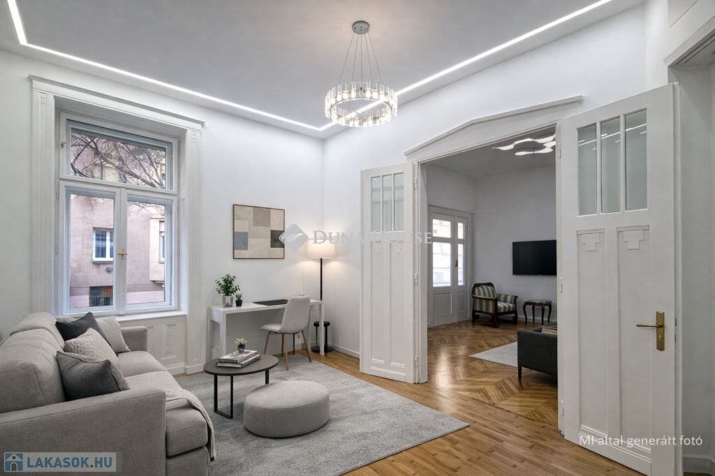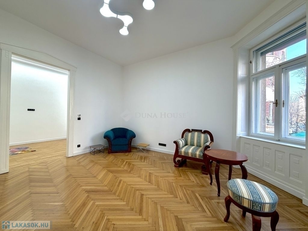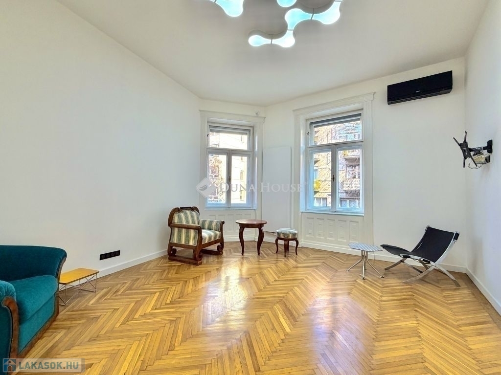 Ebben a környezetben kínálunk megvételre egy 100 m²-es, igényesen felújított lakást, amely egy liftes, téglaépítésű társasház félemeletén található. A 3 métert meghaladó belmagasság és a jól átgondolt térszervezés kellemes, tágas térérzetet ad az ingatlannak.