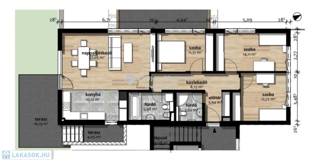 A hirdetésben szereplő ingatlan a földszinten helyezkedik el, 97 négyzetméter +338 négyzetméter saját használatú kert, + 21 négyzetméter terasz, nappali-amerikai konyha, 3 hálószoba, fürdő és 2 erkély került kialakításra. A garázs vételára 12 Millió Ft/db, a tároló 5 - 8,5 négyzetméteres 1,2 Millió Ft/nm.