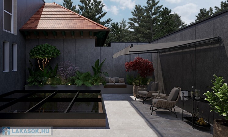 Saját, kb. 180 m²-es privát kert, melyet holland élő borostyánpanel kerítés ölel körbe, különleges atmoszférát teremtve