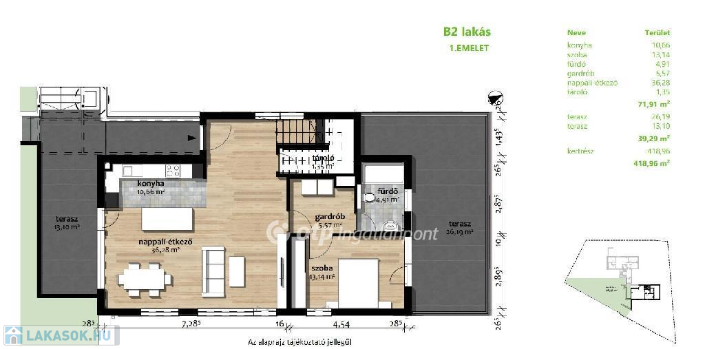 A megvételre kínált ingatlan szinte önálló családi házként került kialakításra. Ugyan az első emelettől indul az ingatlan alsó része, de kétszintes kialakításának + a padlásnak köszönhetően, továbbá, hogy csak egy alsó, szeparált szomszédja van így az önálló családi ház érzést nyújtja. 210 nm-es lakóterületen összesen 5 szobát alakítottak ki, a kedvező térszerkezetnek köszönhetően mindegyik külön nyílik és jól szeparált egymástól. A tervezők arra is figyeltek, hogy két master bedroom (privát gardróbbal és fürdővel) is kialakításra került, egy a földszinten, egy pedig az emeleten. A padlástér további 63,5 nm, melynek hasznosítása az új tulajdonos fantáziájára van bízva. A nappali és az alsó szinten lévő háló közvetlen, összesen 40 nm-es terasz és 384 nm-es privát kert kapcsolattal rendelkezik. Elosztását tekintve nappali + 4 hálószobával rendelkezik, jól elkülönülten, hogy a család minden tagjának meglegyen az intim szférája. Két fürdőszoba került kialakításra, így dupla komfortosnak tekinthetjük, a privát kertkapcsolat a teraszról érhető el. Hatalmas és egyben jól tájolt nyílászáróinak köszönhetően a nap minden szakaszában világos, tájolása Dél-nyugati.