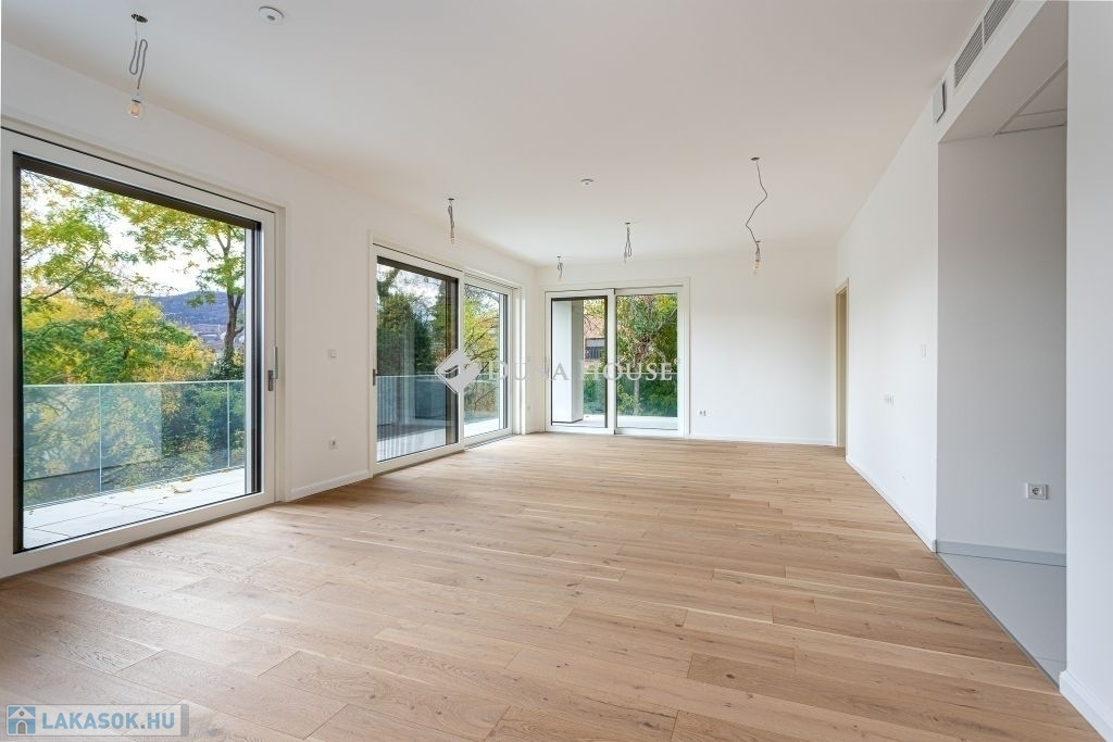 Kertkapcsolat a földszinten, zöld lombkoronás kilátás az emeleten, és lélegzetelállító panoráma a penthouse-ból - mindez elegáns, prémium kivitelben.