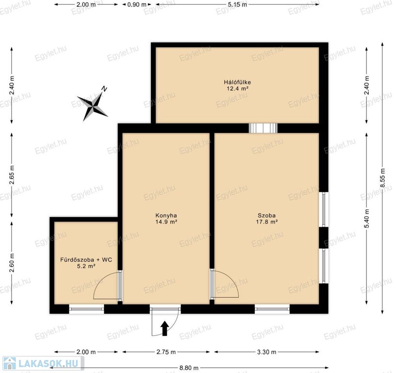 - konyha, szoba + tágas hálófülke, fürdőszoba WC-vel elrendezés;