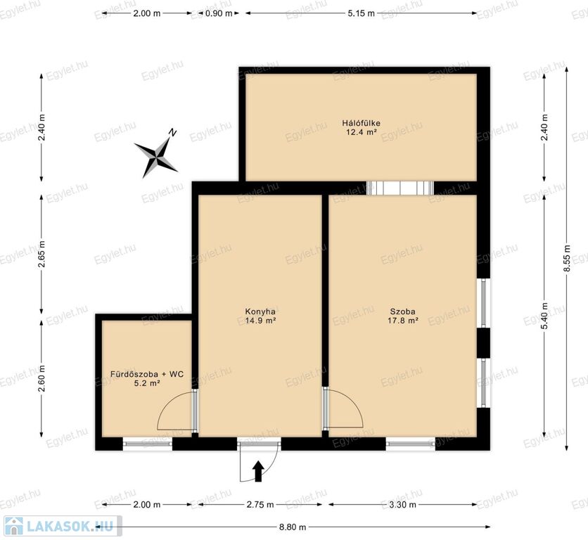 - konyha, szoba + tágas hálófülke, fürdőszoba WC-vel elrendezés;