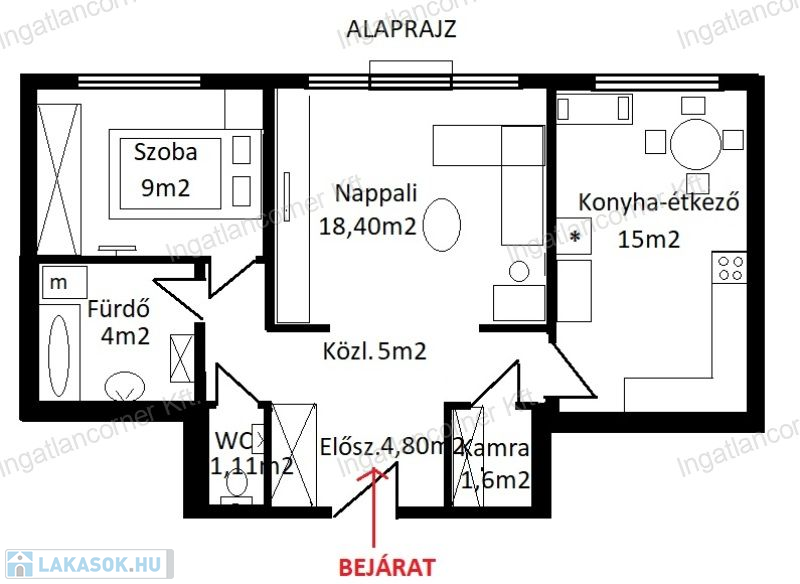 Elosztását tekintve jelenleg nappali (18m2) + 1 hálós (9m2) + egy különálló (15m2) konyha-étkezővel rendelkezik, amely egy kisebb átalakítással, tehát a nappali helyiségbe helyezett konyhával könnyen NAPPALI + 2 HÁLÓS LAKÁSSÁ ALAKÍTHATÓ!