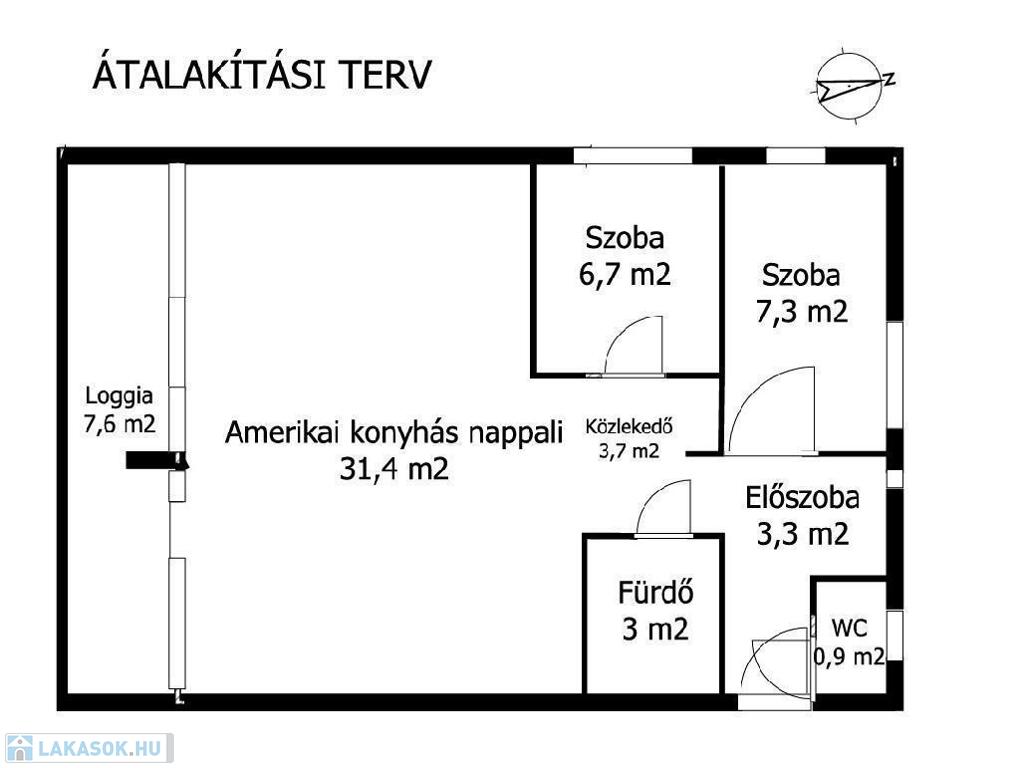 Jó alaprajzának köszönhetően több átalakítási lehetőség is rejlik a lakásban, amely amerikai konyhás nappali + 2 hálószobás lakássá is alakítható.