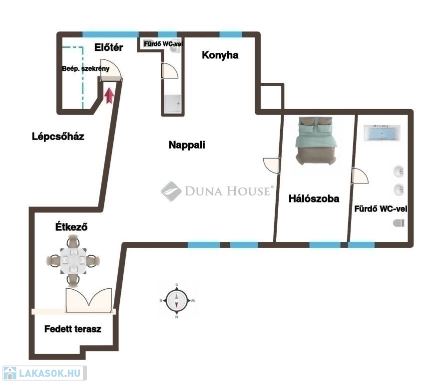 49 m2-es, fedett teraszos, belső kertre néző gyönyörű Otthon egy kevés lakásos, zárt lakóparkban található. A fényárban úszó előtérből a nagyméretű nappaliba érkezünk. Innen nyílik egy elszeparált étkező, abból pedig a hangulatos fedett terasz kilátással a kertész által gondozott belső kertre. Mindkét fürdőszobában olaszos stílusú csempe díszíti a falakat, a nagyobb fürdőszobában pedig egy hatalmas jakuzzis kád is van.