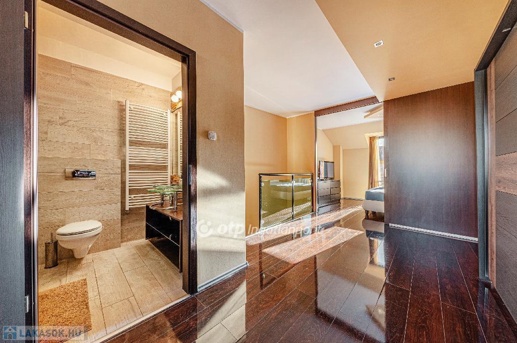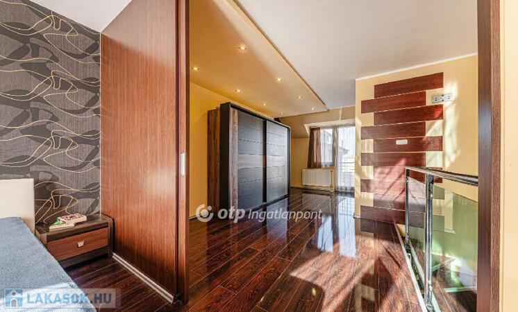 Felső szint: Egy kényelmes hálószoba, egy tágas dolgozószoba (ami könnyedén második hálószobává alakítható!), valamint egy zuhanyzós fürdőszoba és beépített szekrények biztosítják a privát szférát.