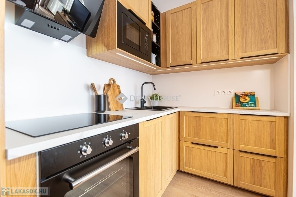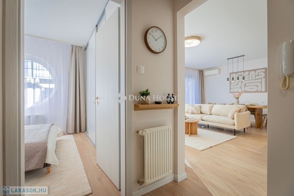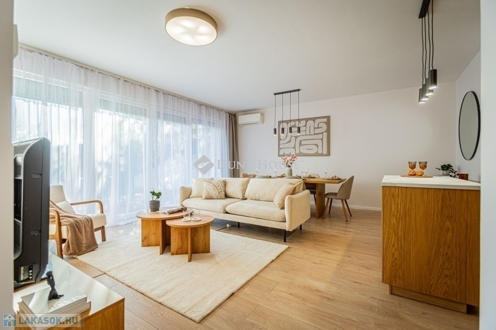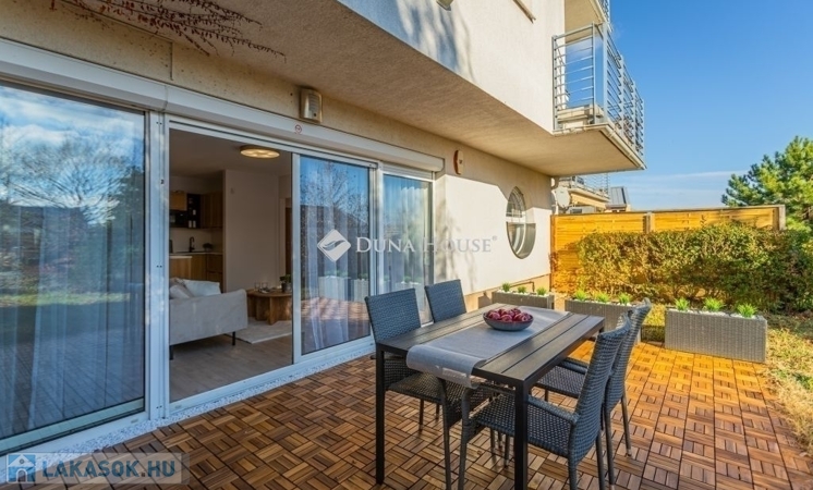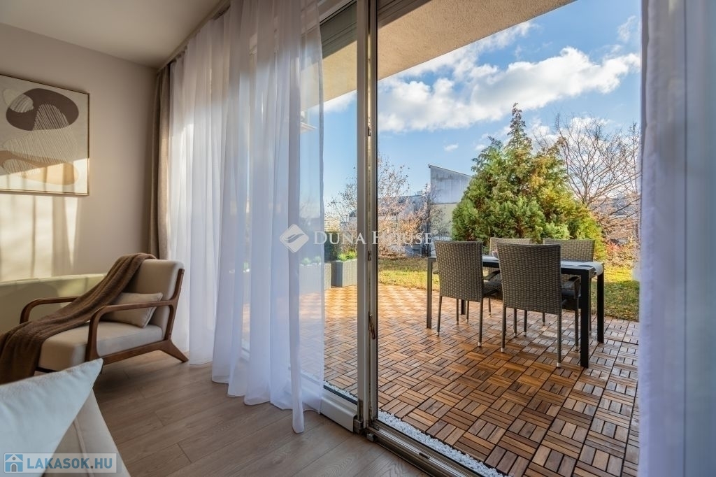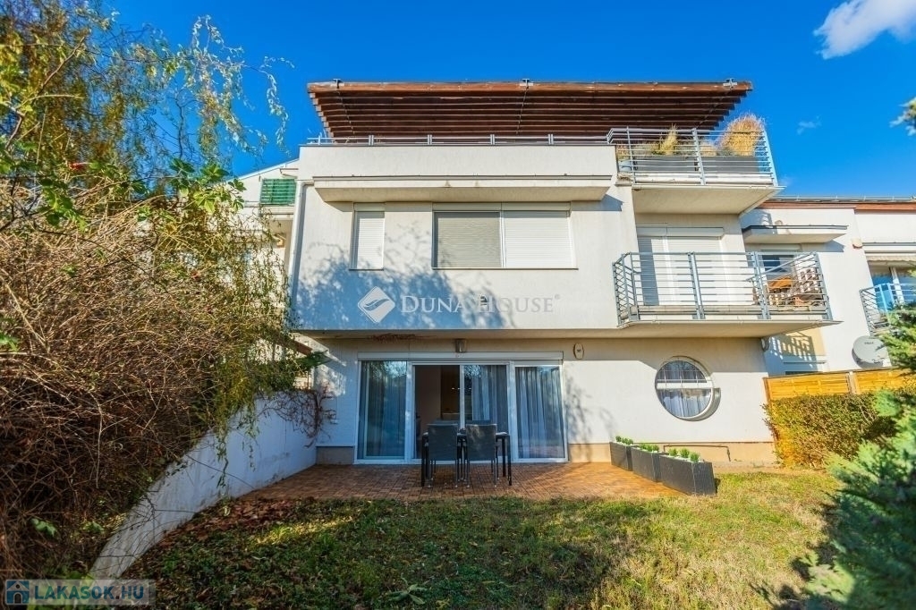Kertkapcsolat, nagy terasz, friss felújítás, modern konyha, külön tároló, teremgarázs mindez egy csendes, biztonságos óbudai lakóparkban.