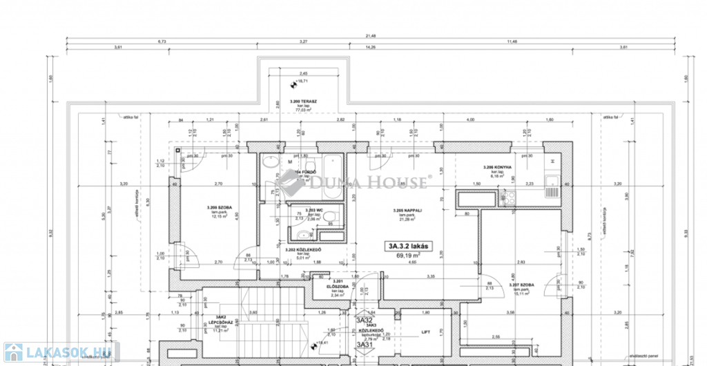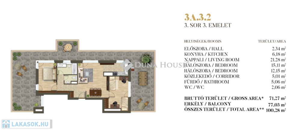 A lakás 3. emeleten helyezkedik el, 72nm-en, nappali + 2 hálóval, valamint további 77 négyzetméteres tetőterasszal, amelyről páratlan panorámában gyönyörködhetünk, bármely napszakban és ami az egész lakást körülöleli.