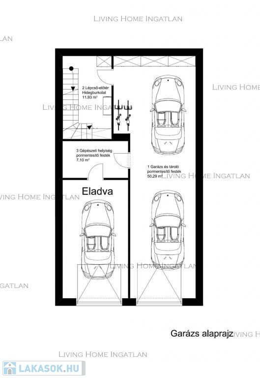 A PINCÉBEN - 2 lakás részére- 3 állásos garázs, gépészeti terek és hátul nagy méretű tároló van. Itt biztosítunk teret szauna építésre vagy akár konditerem kialakítására is.
