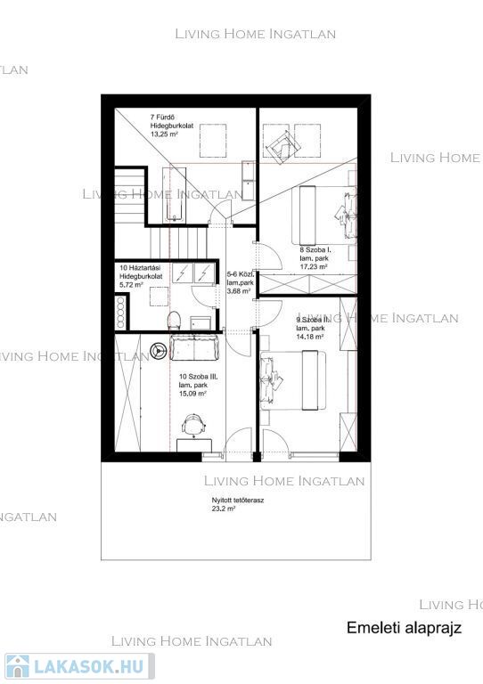 AZ EMELETEN -A lépcsőről felérve, fényárban úszó térbe érkezünk. Itt kapott helyet 2 szoba és egy újabb fürdőszoba.