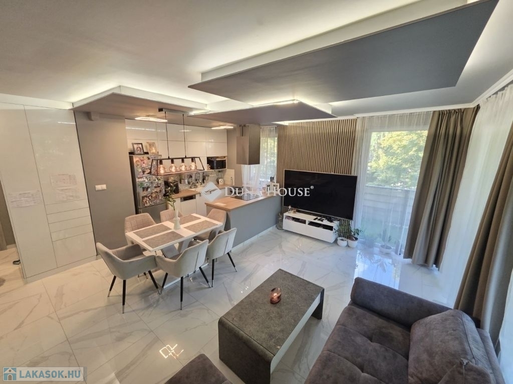 A 65 m²-es lakás igényes belső kialakítással, 21 m²-es tágas terasszal, 5 m²-es külön tárolóval, valamint saját teremgarázs-beállóval rendelkezik, minden az ár részét képezi.